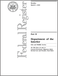 This is the revised list of migratory birds (the 10.13 list) dated March 1, 2010. The significant change in the revision is removal of the Barbary Falcon from the list of species protected under the MBTA.